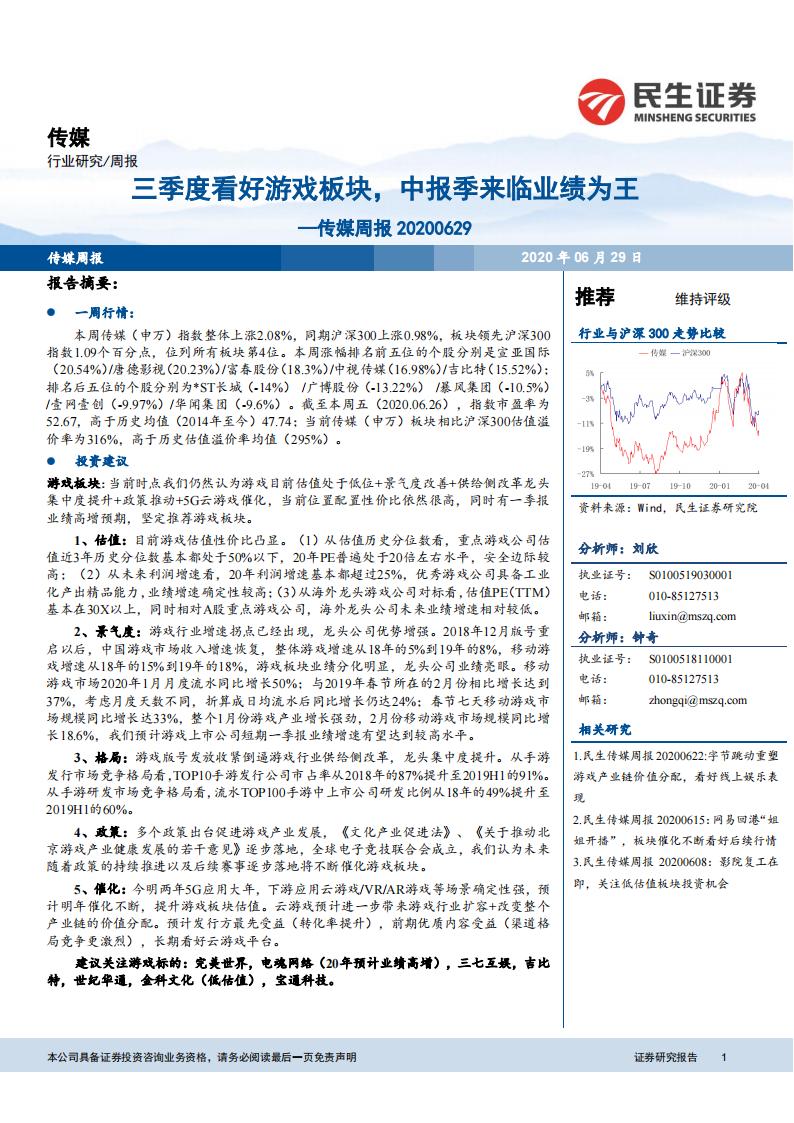 民生证券:传媒周报:三季度看好游戏板块,中报季来临业绩为王.pdf