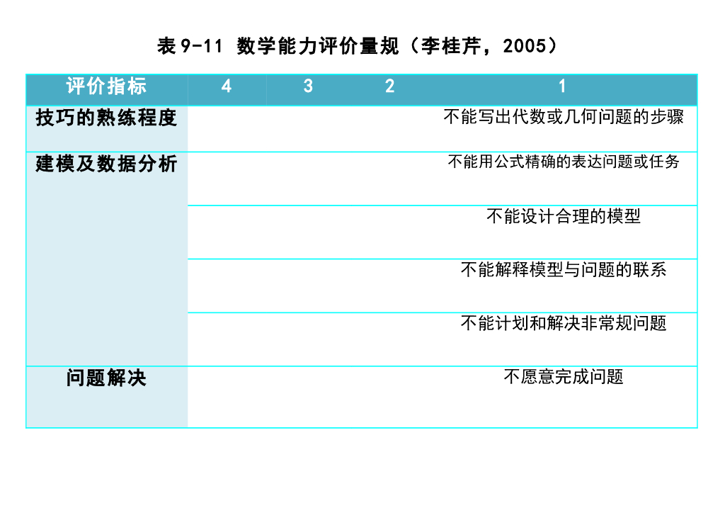 《现代教育技术应用》教学课件-自主学习:评价量规的设计误区分析【表9-11 数学能力评价量规(李桂芹,2005)】.pdf