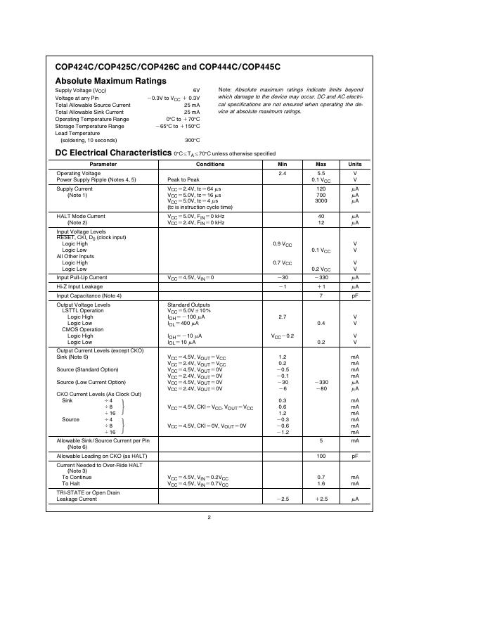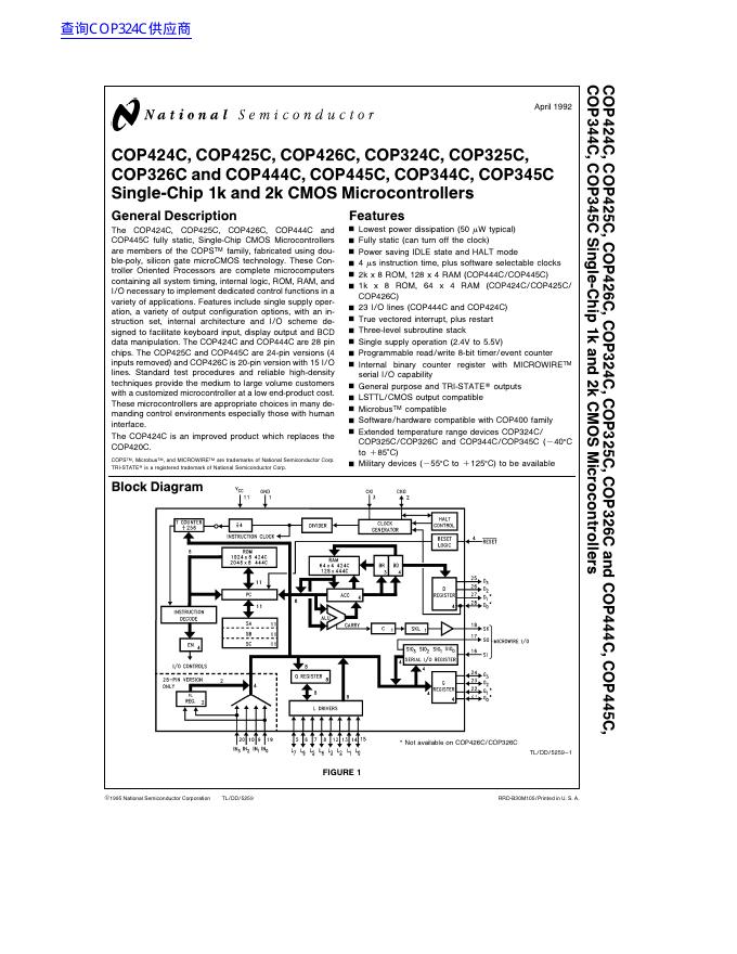 National Semiconductor COP424C, COP425C, COP426C, COP324C, COP325C, COP326C and COP444C, COP445C, COP344C, COP345C Single-Chip 1k and 2k CMOS Microcontrollers 数据手册.pdf