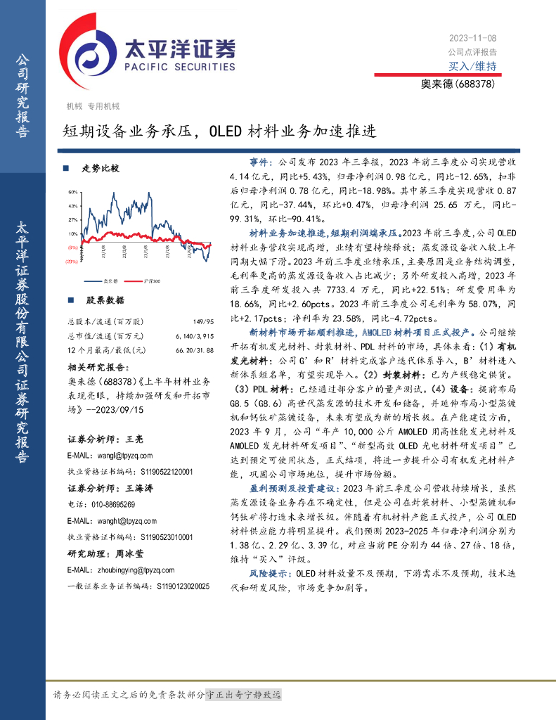 太平洋证券:奥来德(688378)-短期设备业务承压,OLED材料业务加速推进.pdf