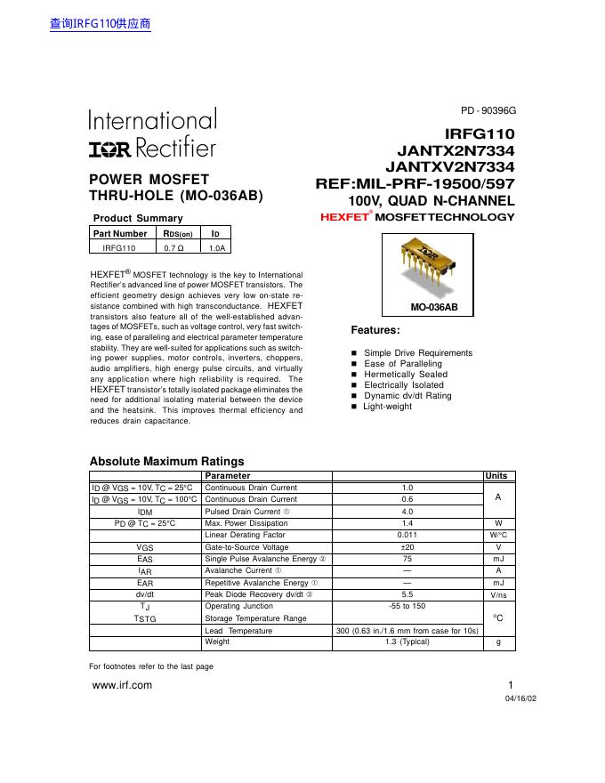 International Rectifier IRFG110/JANTX2N7334/JANTXV2N7334 数据手册.pdf
