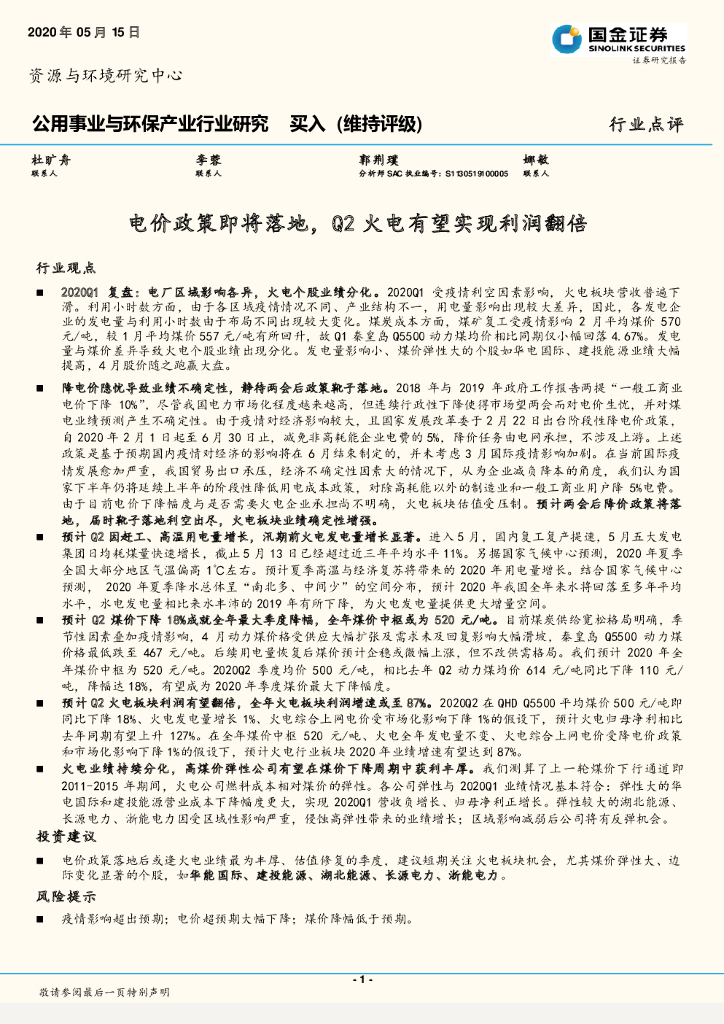 国金证券:公用事业与环保产业行业研究:电价政策即将落地,Q2火电有望实现利润翻倍.pdf