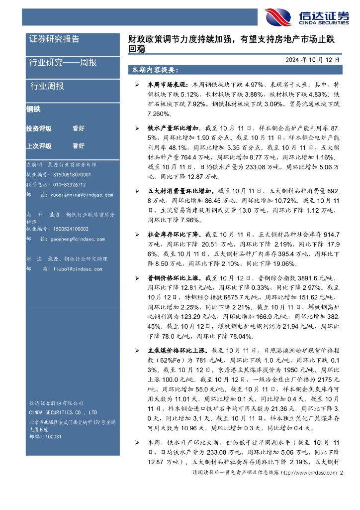 信达证券:钢铁行业周报:财政政策调节力度持续加强,有望支持房地产市场止跌回稳.pdf