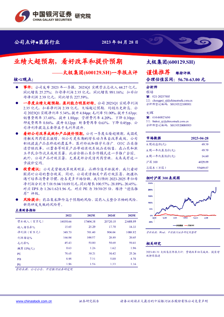 中国银河:太极集团(600129)-一季报点评:业绩大超预期,看好改革和提价预期.pdf