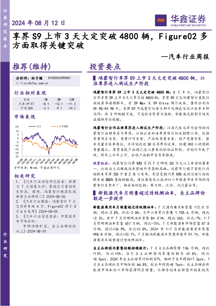 华鑫证券:汽车行业周报:享界S9上市3天大定突破4800辆,Figure02多方面取得关键突破.pdf