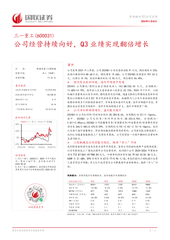 国联证券:三一重工(600031)-公司经营持续向好,Q3业绩实现翻倍增长.pdf