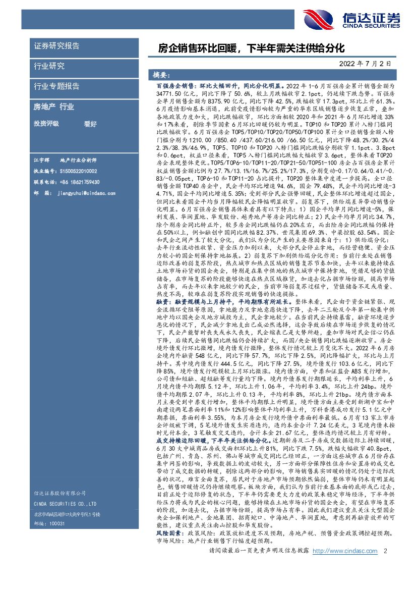 信达证券:2022年1-6月房企销售融资数据点评:房企销售环比回暖,下半年需关注供给分化.pdf