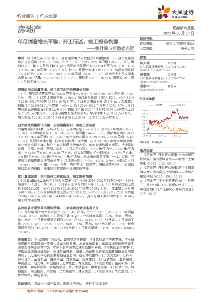 天风证券:房地产行业统计局5月数据点评:单月销售增长平稳,开工低迷,竣工略有恢复.pdf