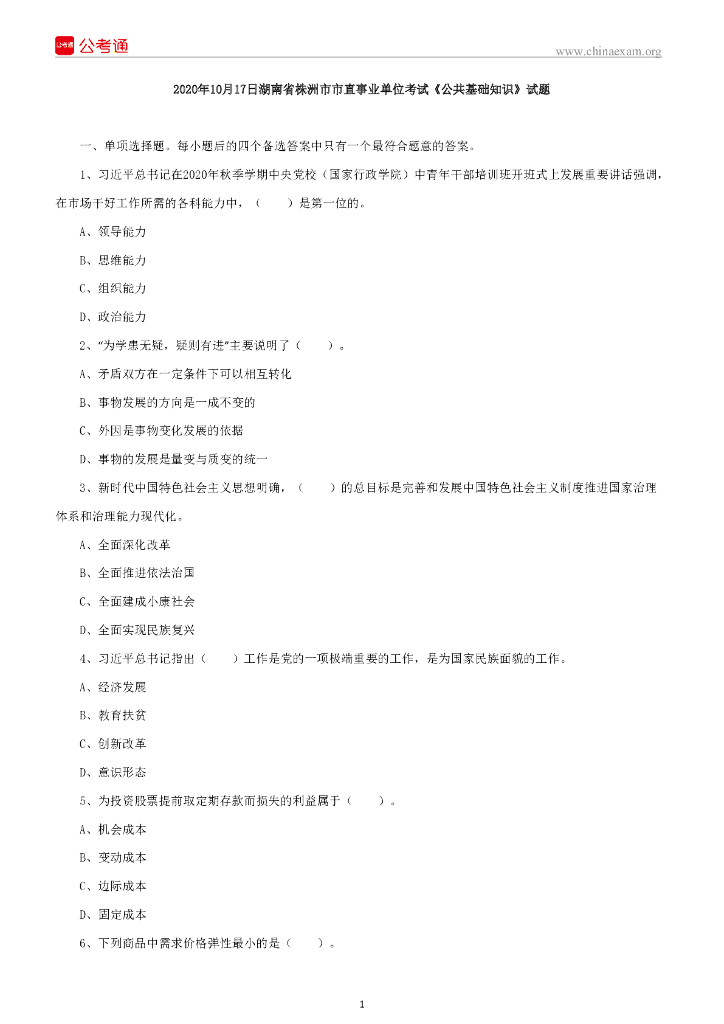 2020年10月17日湖南省株洲市市直事业单位考试《公共基础知识》试题.pdf