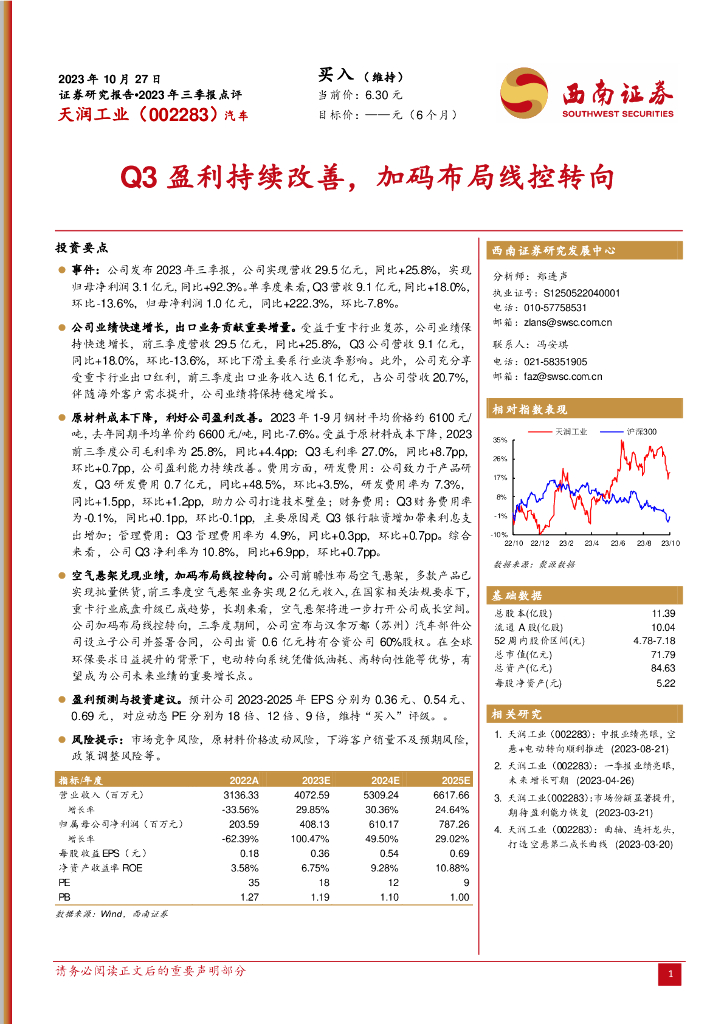 西南证券:天润工业(002283)-2023年三季报点评:Q3盈利持续改善,加码布局线控转向.pdf