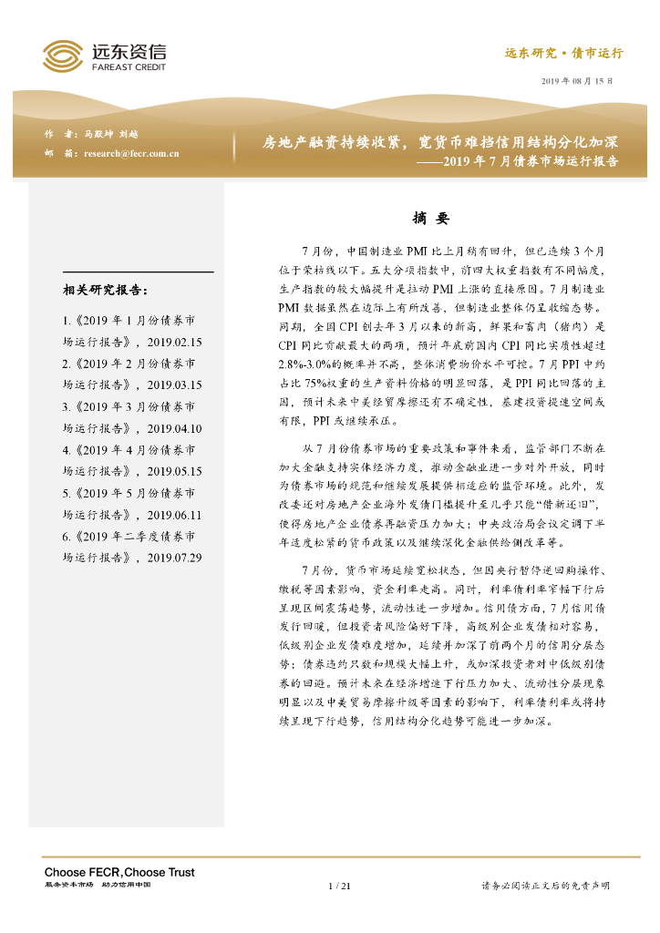 远东资信:2019年7月份债券市场运行报告:房地产融资持续收紧,宽货币难挡信用结构分化加深.pdf