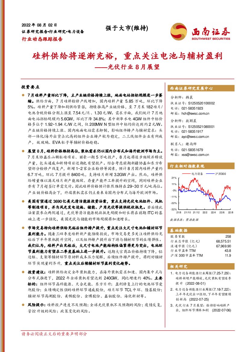 西南证券:光伏行业8月展望:硅料供给将逐渐充裕,重点关注电池与辅材盈利.pdf