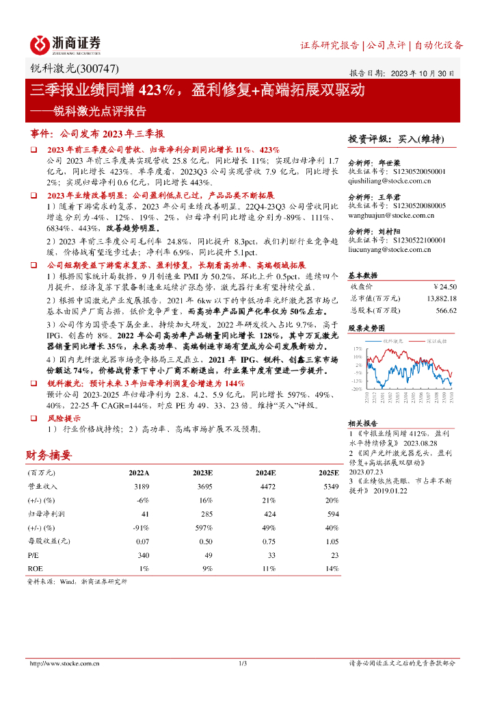 浙商证券:锐科激光(300747)-三季报业绩同增423%,盈利修复+高端拓展双驱动.pdf