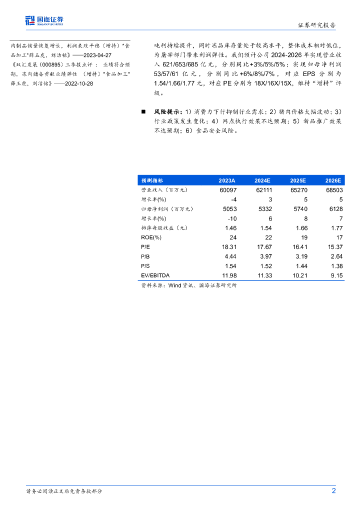 国海证券:双汇发展(000895)-2024年一季报点评:屠宰及养殖拖累利润表现,肉制品吨利创新高.pdf