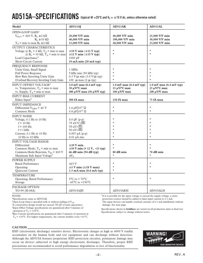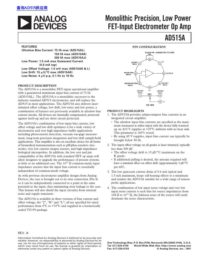 ANALOG DEVICES AD515A Monolithic Precision, Low Power FET-Input Electrometer Op Amp 数据手册.pdf