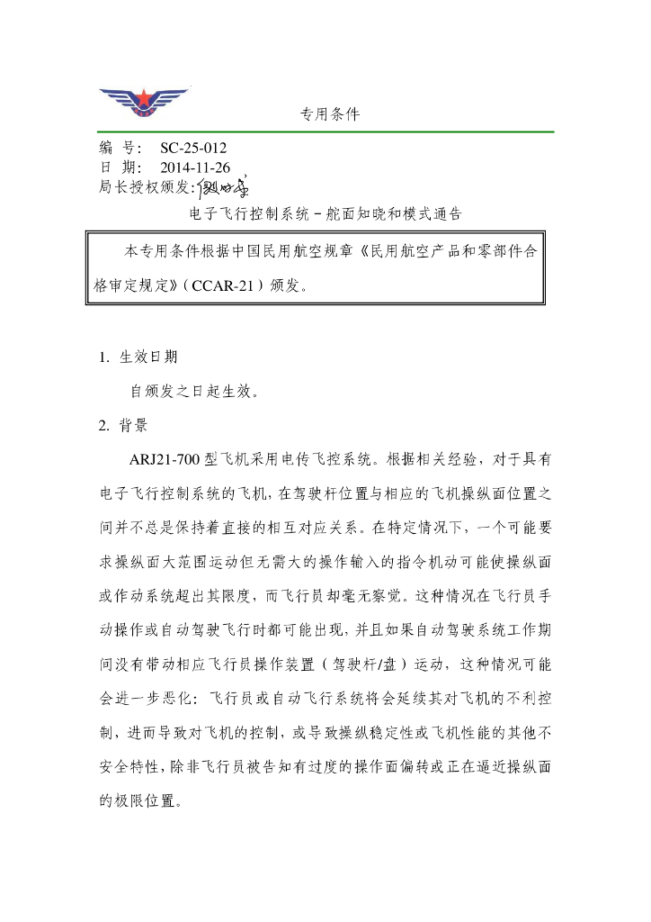 ARJ21-700 型飞机《电子飞行控制系统-舵面知晓和模式通告》专用条件.pdf
