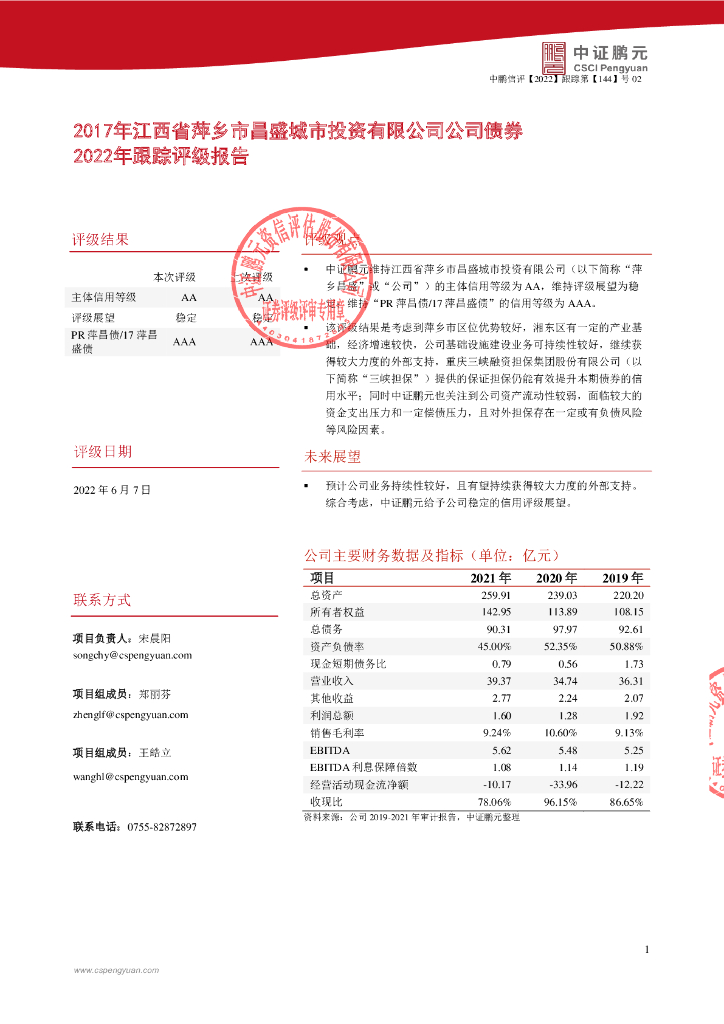 鹏元:2017年江西省萍乡市昌盛城市投资有限公司公司债券2022年跟踪评级报告.pdf