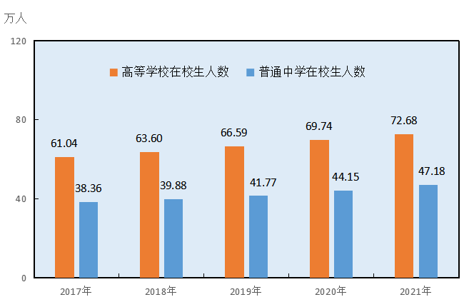 年末全市有普通高校52所,普通高中106所,初中学校259所,普通小学923所。在学研究生8.35万人,比上年末增长5.8%;普通高校在校学生72.68万人,增长4.2%;普通高中在校学生17.55万人,增长9.8%;普通初中在校学生29.63万人,增长5.2%;普通小学在校学生76.13万人,增长7.2%;幼儿园在园幼儿42.9万人,增长5.3%。小学适龄儿童入学率100%,小学升初中入学率103.8%。全年共投入学生免费入学和资助经费18.37亿元,全市所有义务教育阶段205.4万人次学生全部享受了免杂费入学,执行公办教育收费标准的191.3万人次学生全部享受了“一费制”(含课本费、教辅资料费和作业本费)全免入学,在长沙市就读的17.9万名外来务工人员子女,全部享受免杂费、免“一费制”入学。全年补助了9.59万人次农村家庭经济困难寄宿学生生活费。