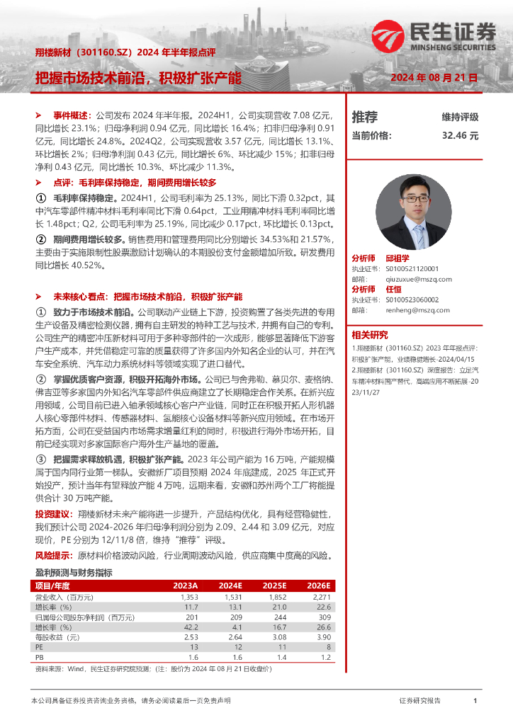 民生证券:翔楼新材(301160)-2024年半年报点评:把握市场技术前沿,积极扩张产能.pdf