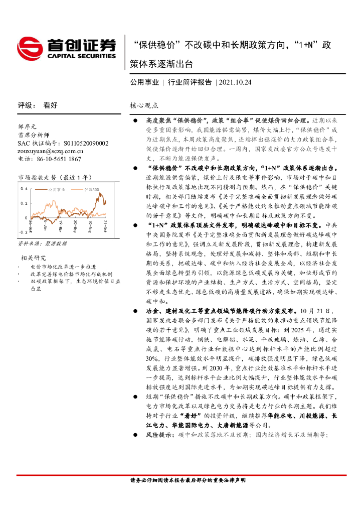 首创证券:公用事业行业简评报告:“保供稳价”不改碳中和长期政策方向,“1+N”政策体系逐渐出台.pdf