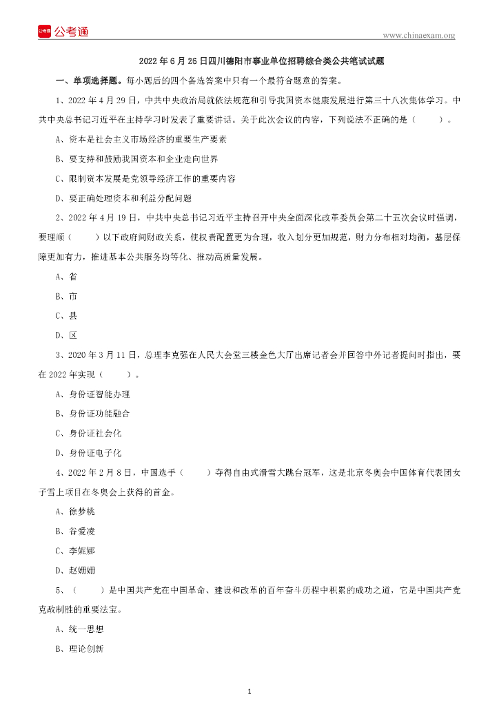 2022年6月26日四川德阳市事业单位招聘综合类公共笔试试题.pdf