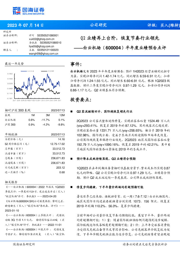 国海证券:白云机场(600004)-半年度业绩预告点评:Q2业绩再上台阶,恢复节奏行业领先.pdf