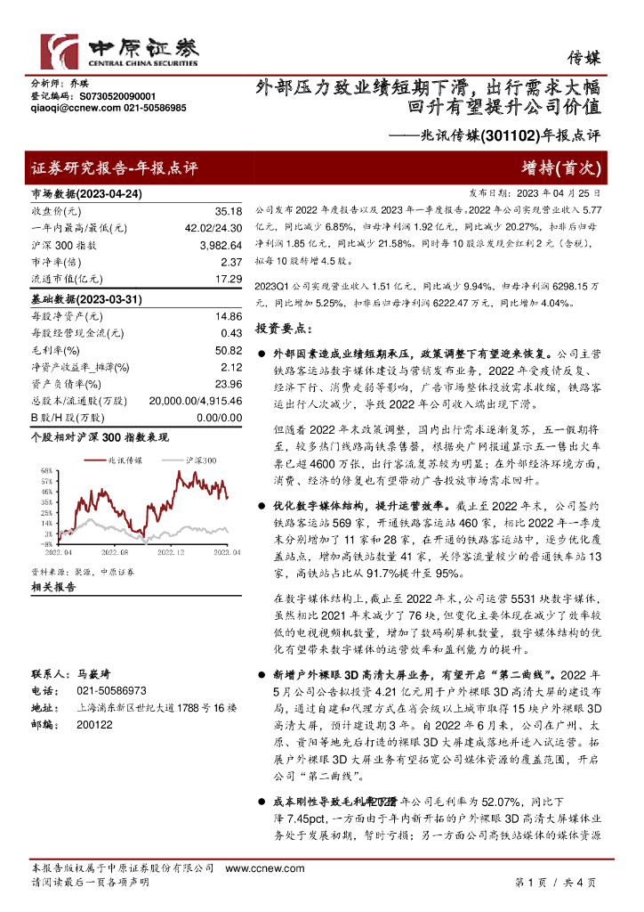 中原证券:兆讯传媒(301102)-年报点评:外部压力致业绩短期下滑,出行需求大幅回升有望提升公司价值.pdf