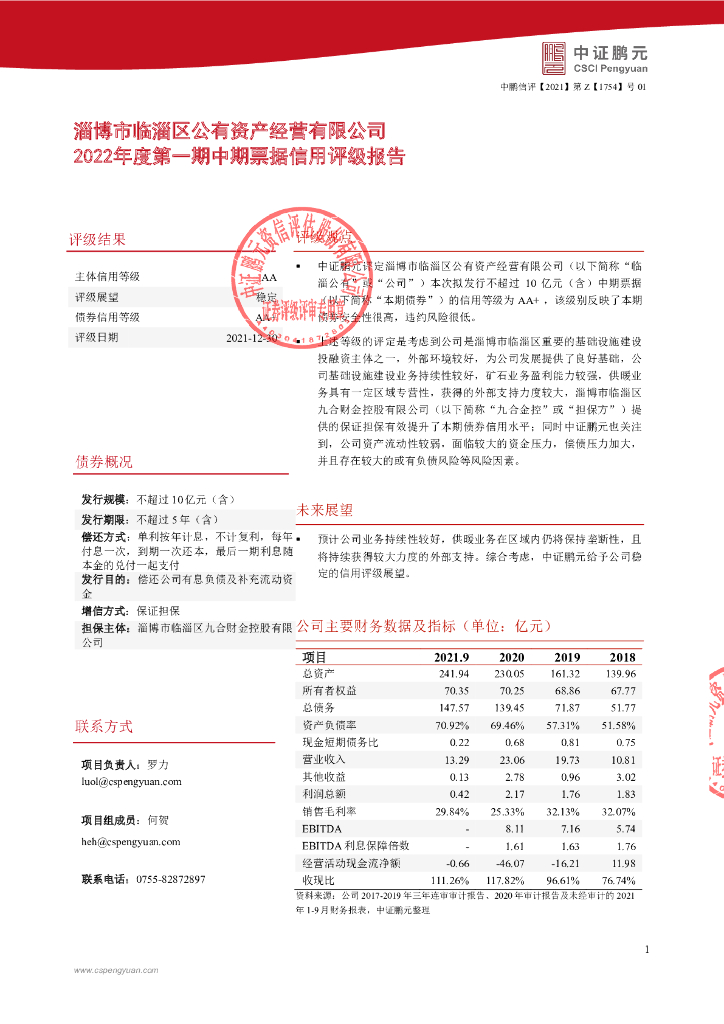 鹏元:淄博市临淄区公有资产经营有限公司2022年度第一期中期票据信用评级报告.pdf