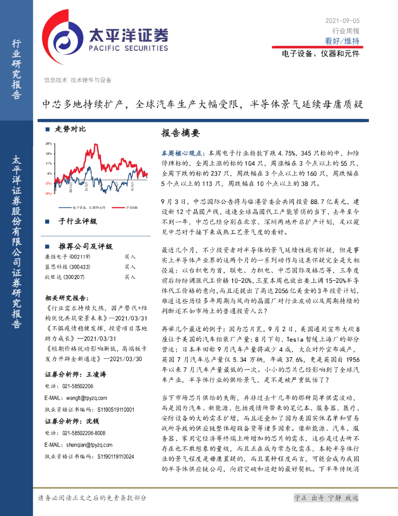 太平洋证券:电子设备、仪器和元件行业周报:中芯多地持续扩产,全球汽车生产大幅受限,半导体景气延续母庸质疑.pdf