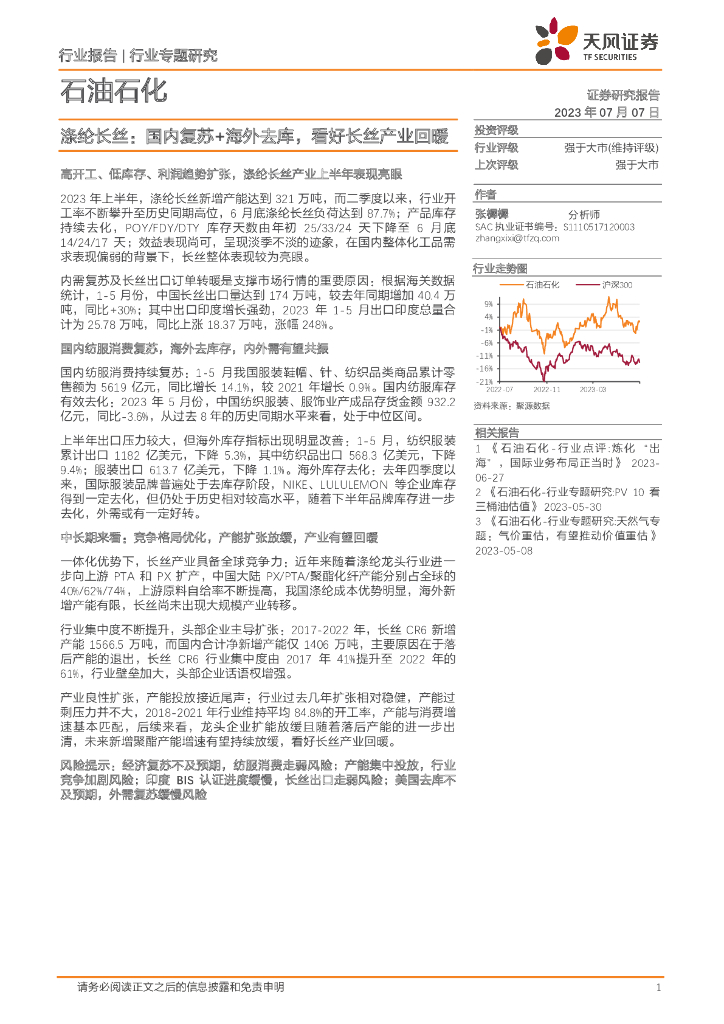 天风证券:石油石化行业专题研究:涤纶长丝:国内复苏+海外去库,看好长丝产业回暖.pdf