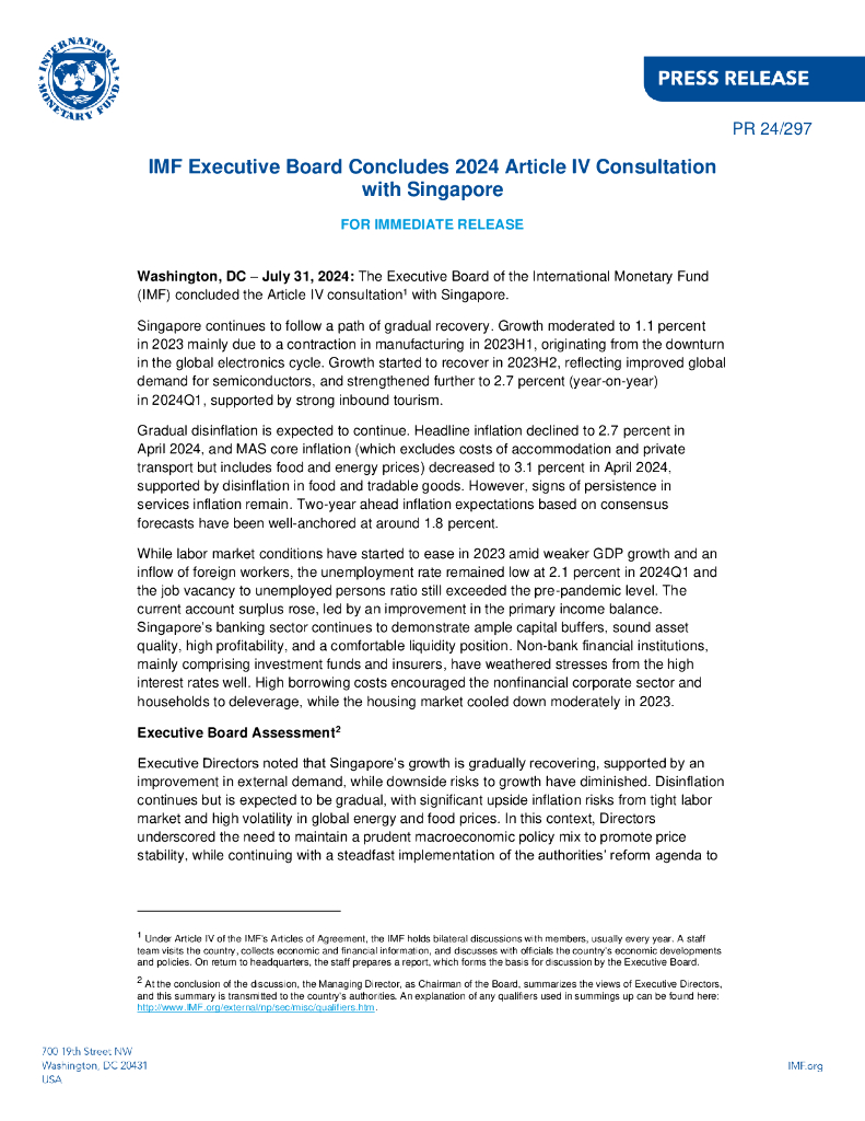 国际货币基金组织:2024年新加坡第四条磋商新闻稿;员工报告(英文版).pdf