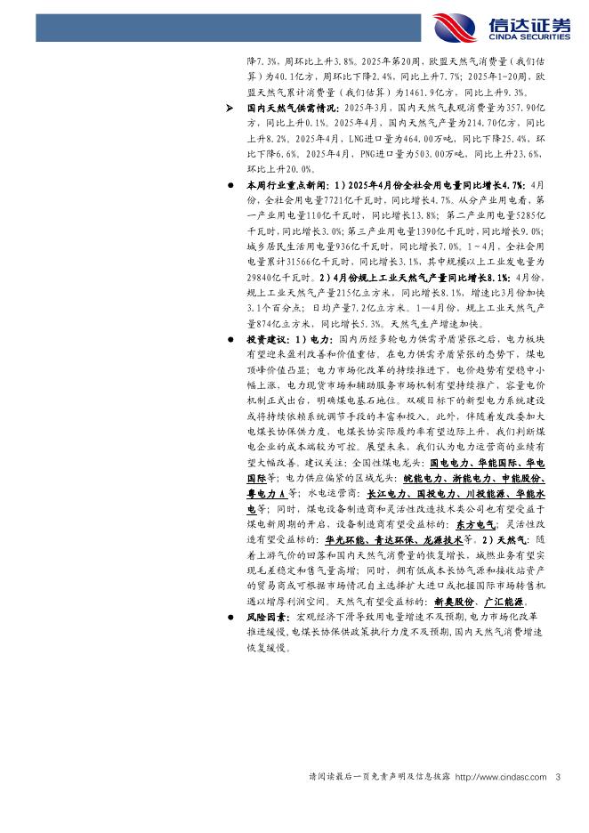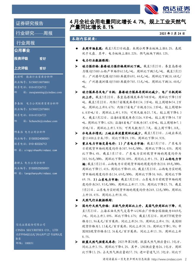 信达证券:公用事业—电力天然气周报:4月全社会用电量同比增长4.7%,规上工业天然气产量同比增长8.1%.pdf