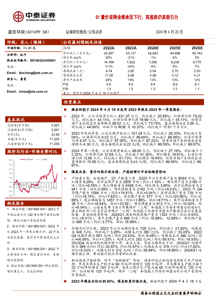中泰证券:潞安环能(601699)-Q1量价双降业绩承压下行,高股息仍具吸引力.pdf