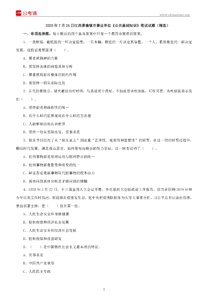 2020年7月25日江西景德镇事业单位《公共基础知识》笔试试题(精选).pdf