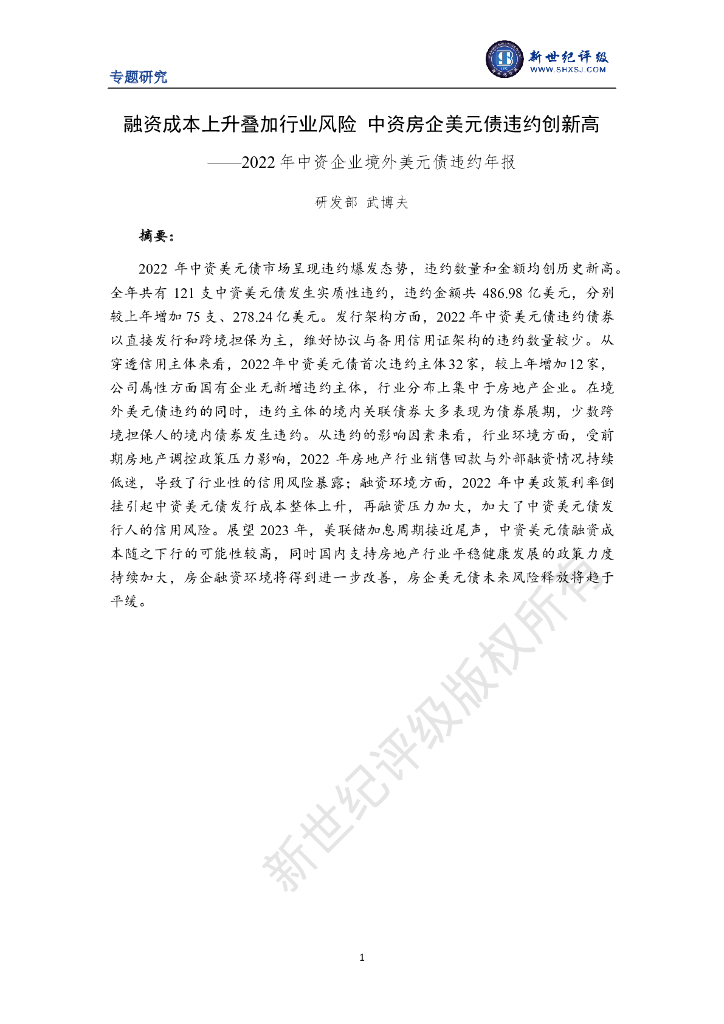新世纪评级:融资成本上升叠加行业风险 中资房企美元债违约创新高——2022年中资企业境外美元债违约年报.pdf