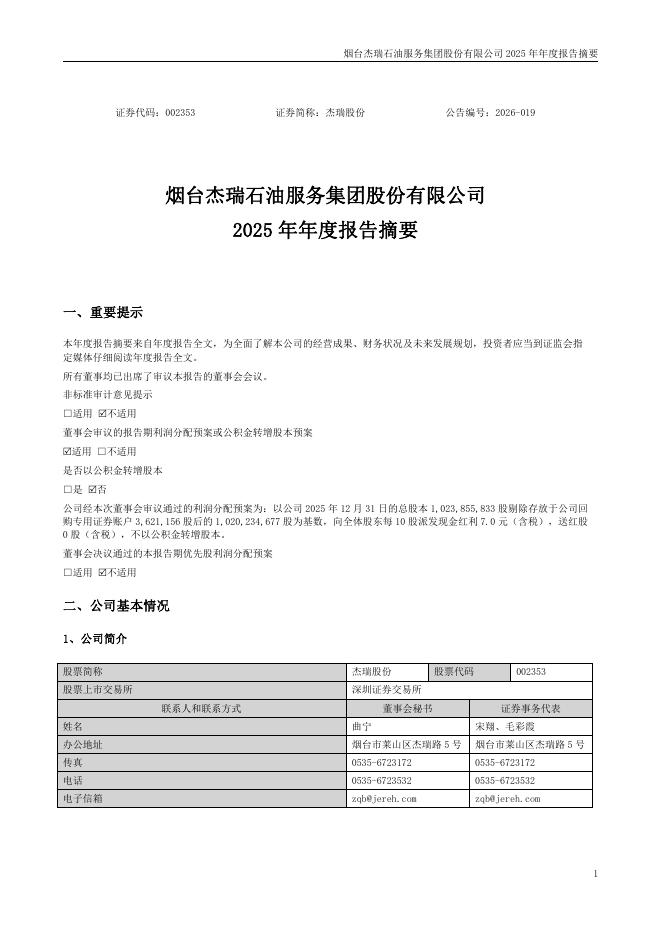 002353-杰瑞股份:2025年年度报告摘要.pdf