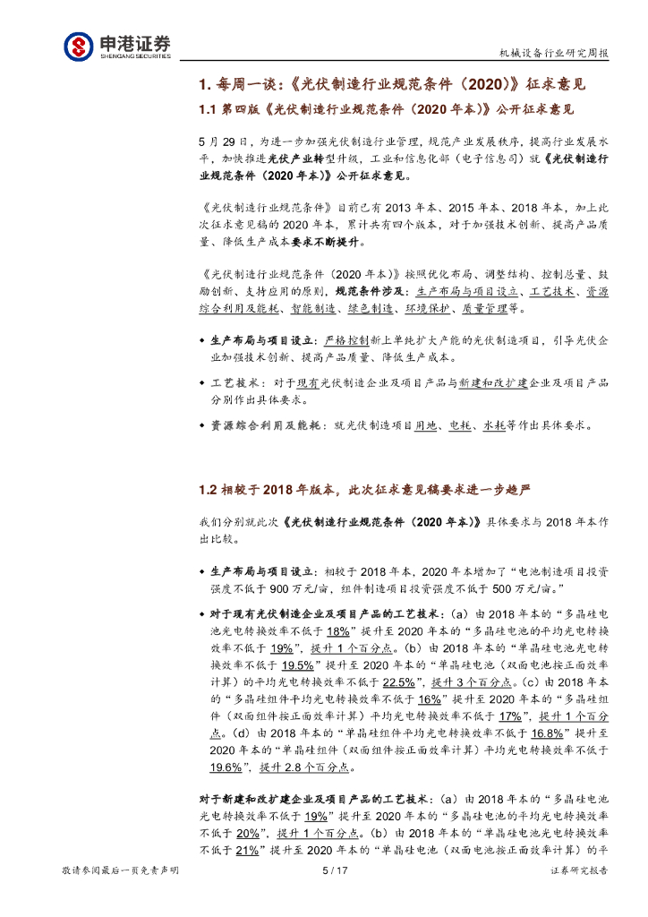 申港证券:机械设备行业研究周报:《光伏制造行业规范条件(2020)》公开征求意见.pdf