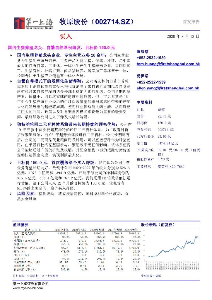 第一上海证券:牧原股份(002714)-国内生猪养殖龙头,自繁自养厚积薄发,目标价150.0元.pdf
