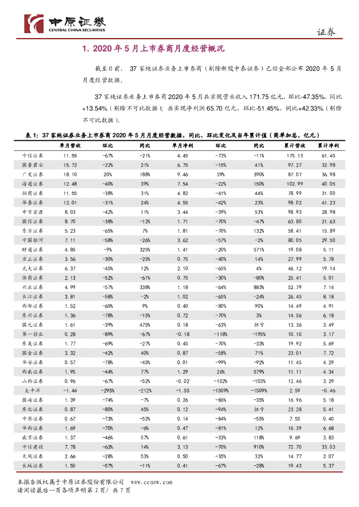 中原证券:上市券商2020年5月月报点评:环比明显下滑、同比仍有改善.pdf