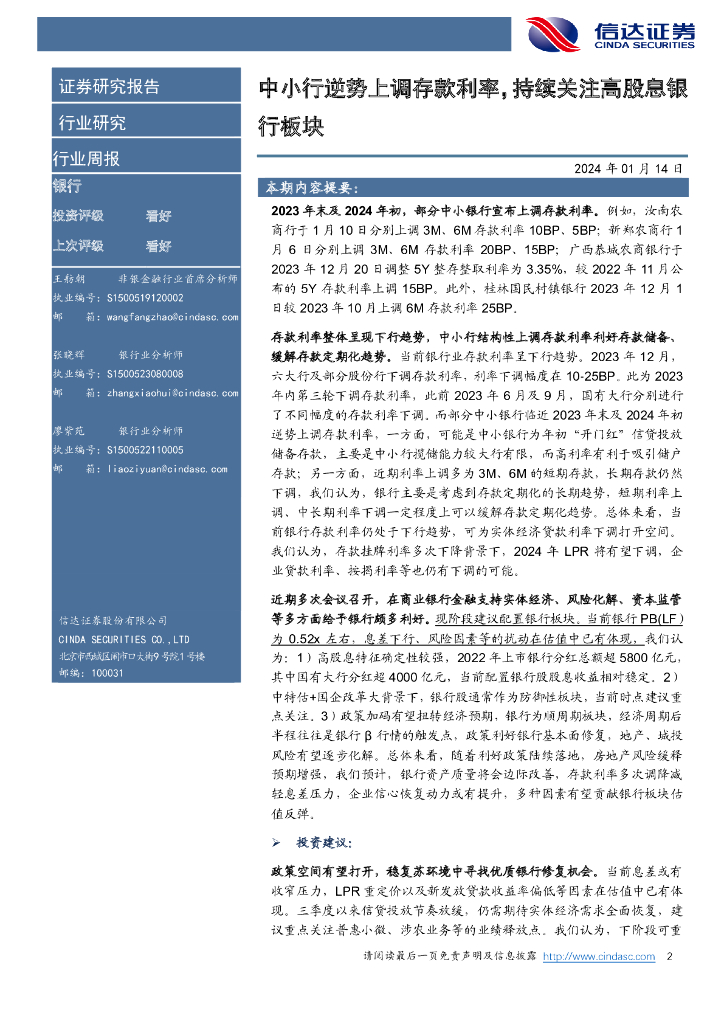 信达证券:银行行业周报:中小行逆势上调存款利率,持续关注高股息银行板块.pdf