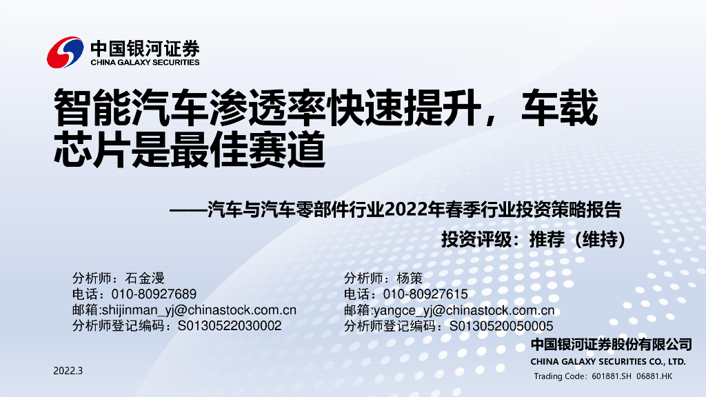 中国银河证券:汽车与汽车零部件行业2022年春季行业投资策略报告-智能汽车渗透率快速提升,车载芯片是最佳赛道.pdf