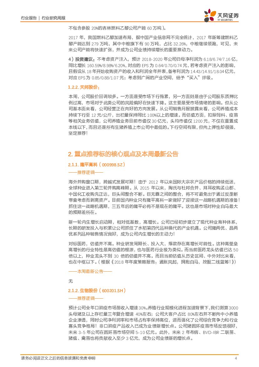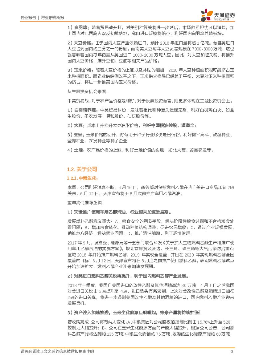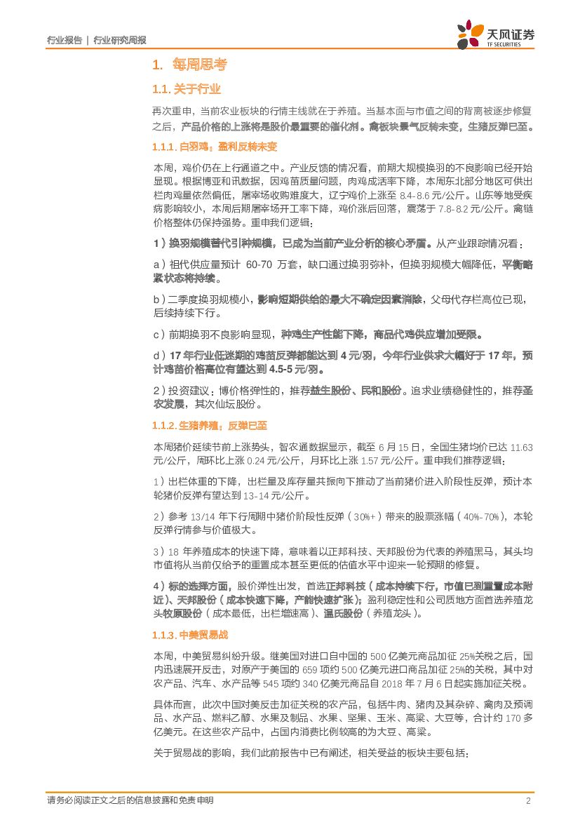 天风证券:农林牧渔行业2018年第24周周报:中美贸易战,农产品加关税!本周继续重点推荐二季度畜禽板块投资机会!(鸡价上涨+引种受限、鸭龙头底部+国企改革、猪价反弹+股价回调).pdf