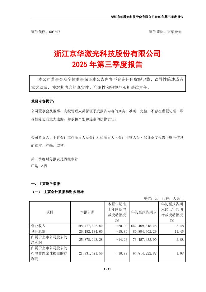 603607-京华激光:京华激光2025年第三季度报告.pdf