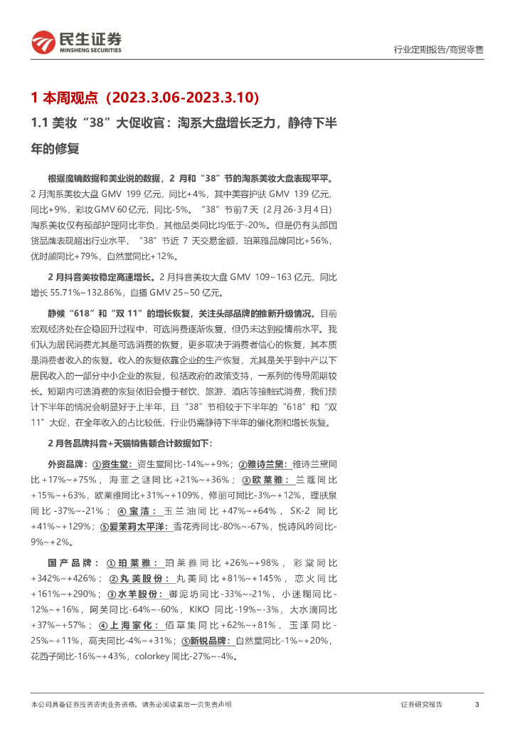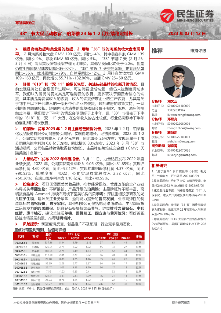 民生证券:零售周观点:“38”节大促活动收官,珀莱雅23年1-2月业绩稳定增长.pdf