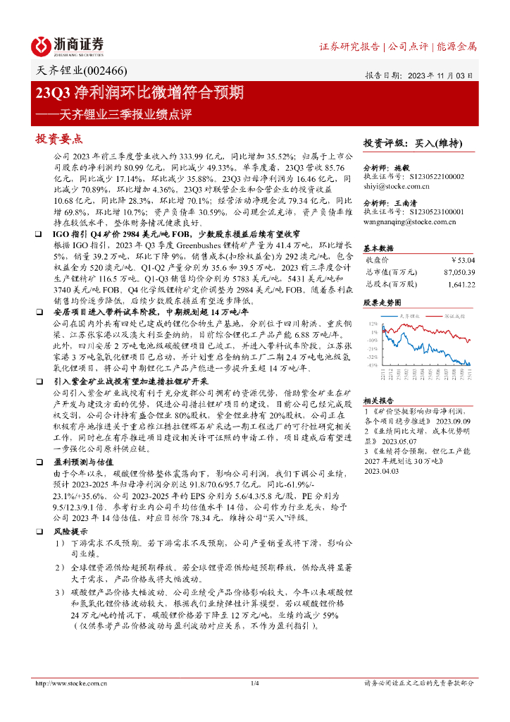 浙商证券:天齐锂业三季报业绩点评:23Q3净利润环比微增符合预期.pdf