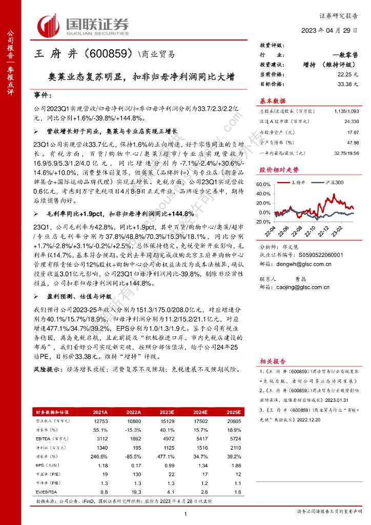 国联证券:王府井(600859)-奥莱业态复苏明显,扣非归母净利润同比大增.pdf