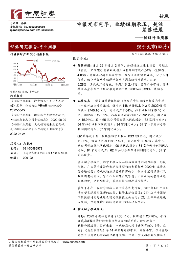 中原证券:传媒行业周报:中报发布完毕,业绩短期承压,关注复苏进展.pdf