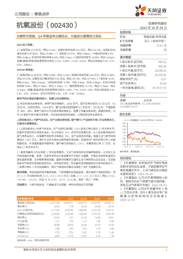 天风证券:杭氧股份(002430)-业绩符合预期,Q4有望迎来业绩拐点,长期成长逻辑依旧坚实.pdf