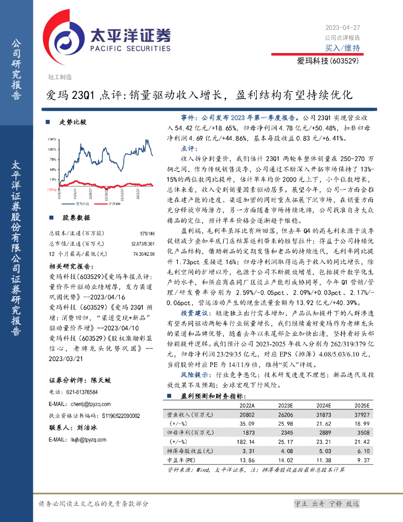 太平洋证券:爱玛科技(603529)-爱玛23Q1点评:销量驱动收入增长,盈利结构有望持续优化.pdf