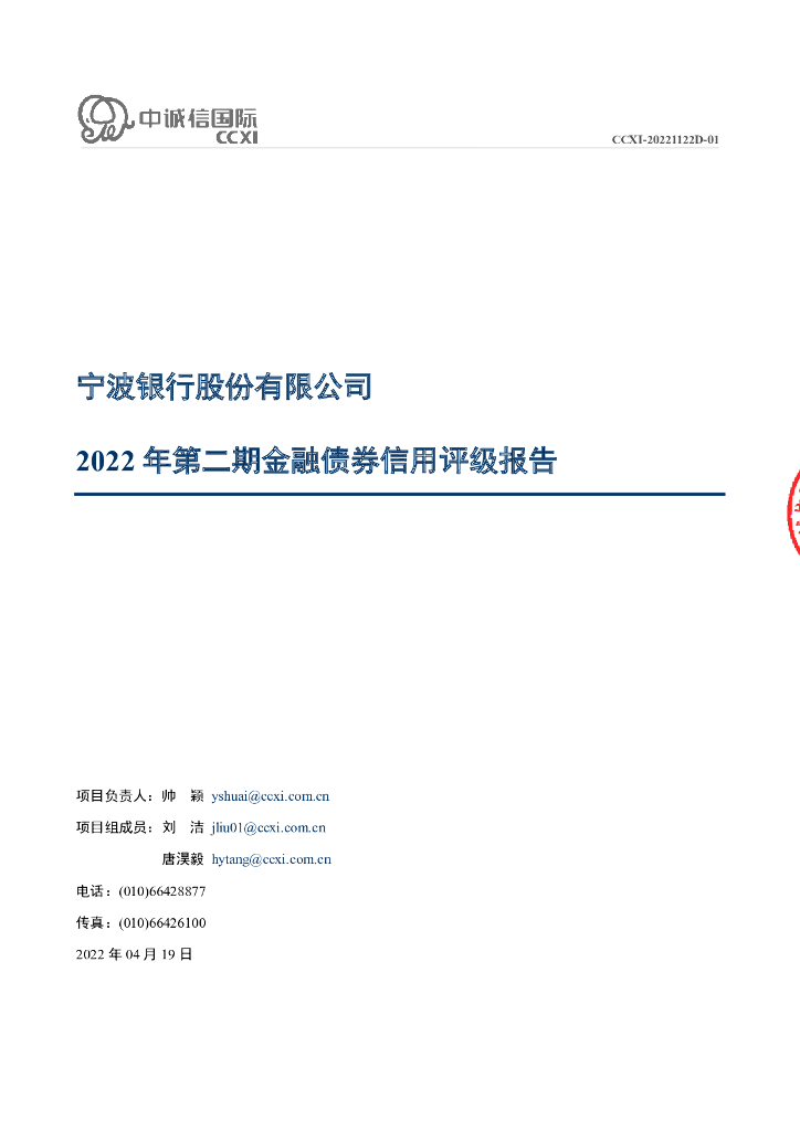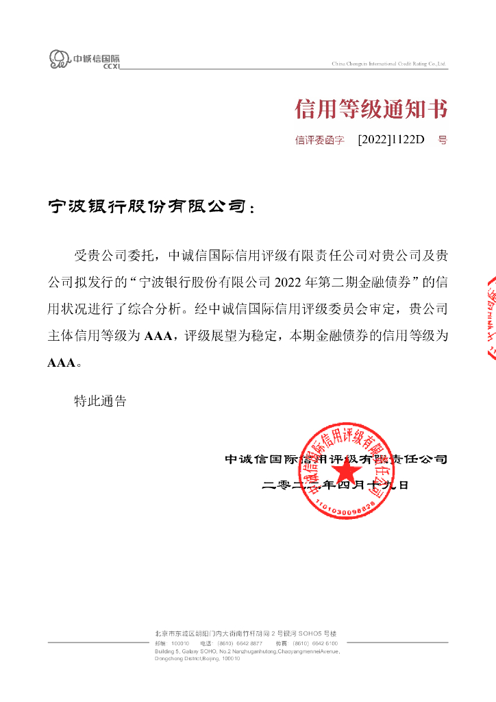 中诚信:宁波银行股份有限公司2022年第二期金融债券信用评级报告及跟踪评级安排.pdf